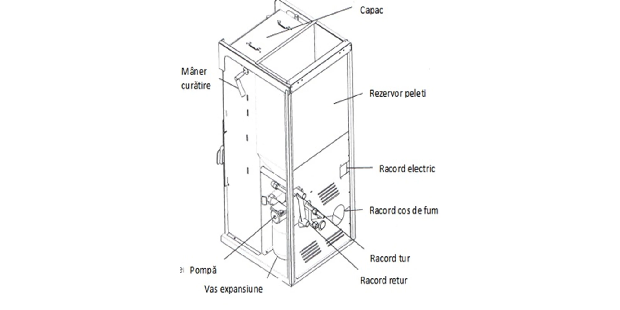 Cazanul pe peleti este prevazut cu toate elementele necesare pentru instalarea in cadrul sistemului de incalzire centrala: