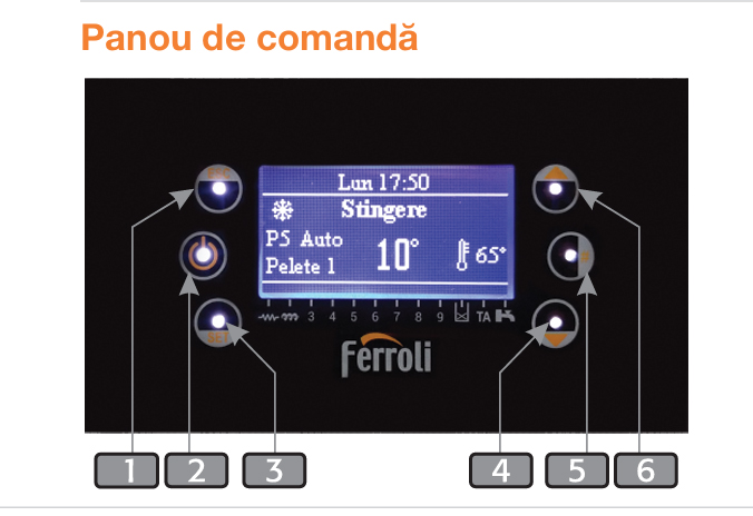 Pornire/oprire, resetarea erorilor (apăsare timp de 3 secunde) activarea/dezactivare programare orară;
