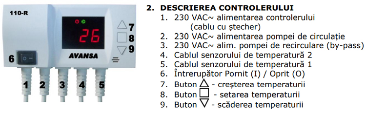 AVANSA 110-R este un controler electronic modern, care poate fi utilizat pentru controlul pompei de circulație și a unei pompei de recirculare (by-pass) a agentului termic din instalațiile de încălzire cu cazan pe combustibil solid. Ca o altă aplicație, în locul pompei de recirculare (by-pass) poate fi comandată o pompă pentru încălzirea în pardoseală.