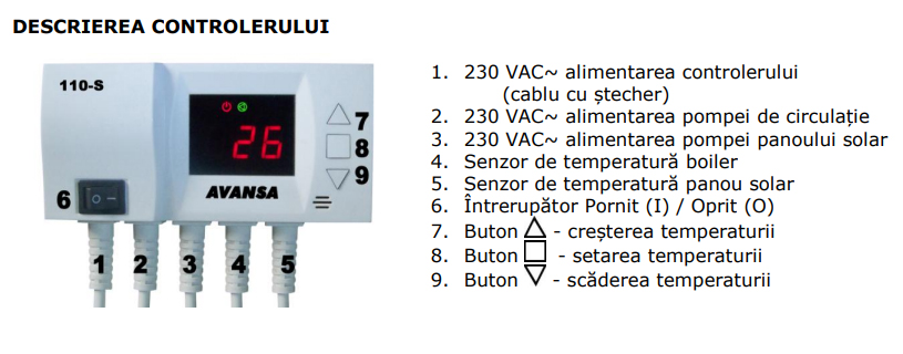 AVANSA 110-S este un controler electronic modern, care poate fi utilizat pentru controlul pompei panoului solar și a pompei de circulație. Rolul controlerului este de a produce circularea forţată a apei între panoul solar şi boilerul (pufferul) de apă caldă. Unul dintre senzori va fi montat la panoul solar şi va măsura temperatura apei din panou şi celălalt va fi montat la boiler şi va măsura temperatura apei din boiler. Controlerul va comanda pornirea sau oprirea pompei în funcţie de diferenţa dintre cele două temperaturi.