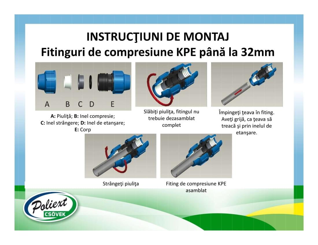 Fitingurile de imbinare prin compresiune KPE, de ramificare si fitingurile de imbinare KPE filetate, sunt utilizate pentru conductele PE cu posibilitate de combinare cu alte fitinguri, doar pentru apa rece.