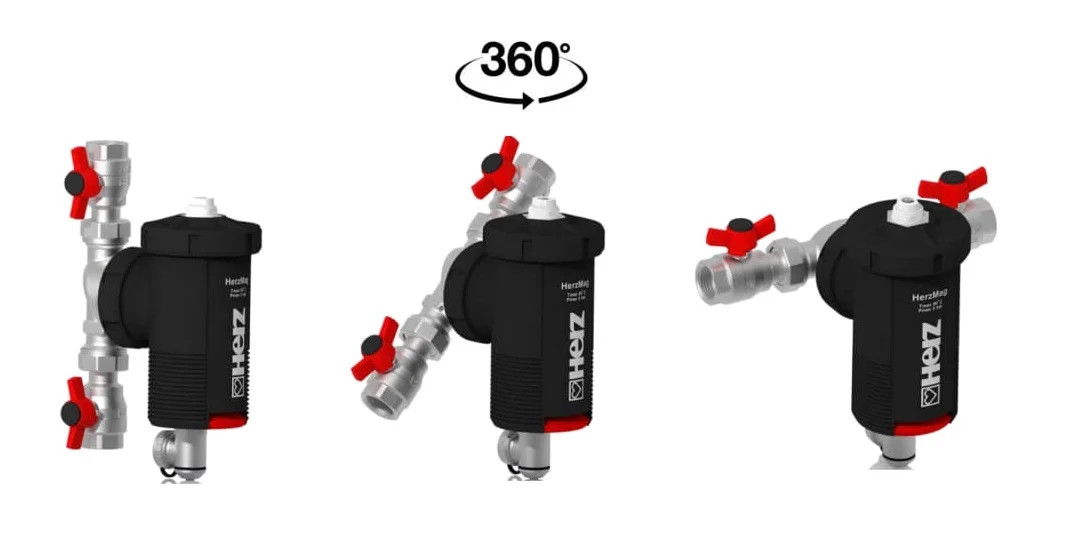 Aerisitorul manual este integrat în HerzMAG pentru separarea aerului. Forma HerzMAG a fost special concepută pentru a reduce în mod semnificativ viteza debitului. Astfel, aerul și microbulele pot urca și sunt evacuate prin orificiul de aerisire. În același mod, impuritățile de fier sunt dirijate în jos, către orificiul de evacuare situat în partea inferioară a dispozitivului, care este echipat cu un robinet de golire. Acest proces este susținut și de magnet, a cărui poziție permite o captare eficientă.
