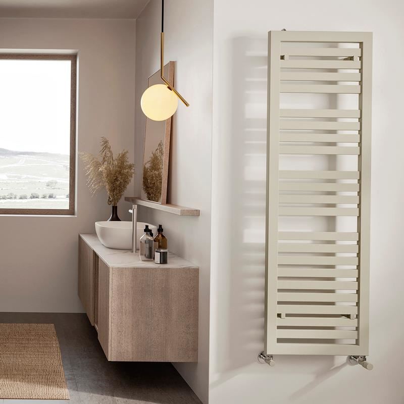 Oddo, uscător de prosoape cu ramă şi cu două feţe. Alegerea feţei care va rămâne vizibilă, cea cu tubul plat sau cea cu tubul rotunjit, se face în momentul instalării. Disponibil în 4 variante de înălţime şi 3 variante de lăţime. Mulţumită rezistenţei electrice (disponibilă opţional), poate funcţiona chiar şi atunci când instalaţia de încălzire este oprită.