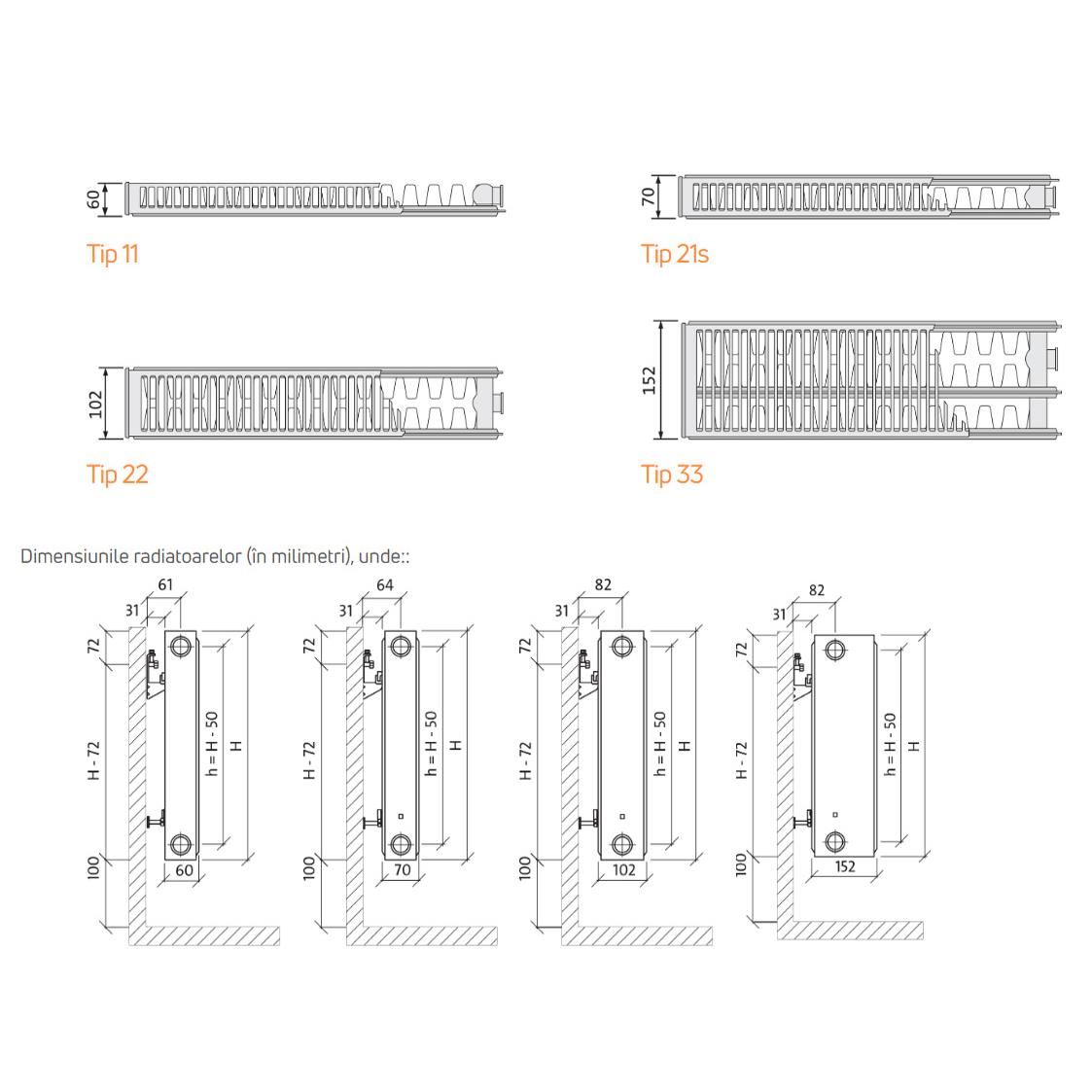 Înălţimea radiatoarelor:300, 450, 500, 550, 600, 900 mm