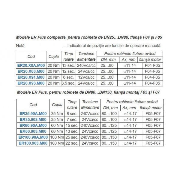 - Modele ER Plus compacte, pentru robinete de DN25…DN80, flansa F04 si F05 - Nota: Indicatorul de pozitie are functie de operare manuala.