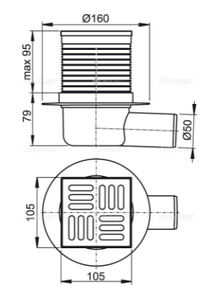 Sifon pardoseală 105×105/50 mm ieşire laterală, grătar din oţel inoxidabil, sistem de reţinere a mirosurilor umede