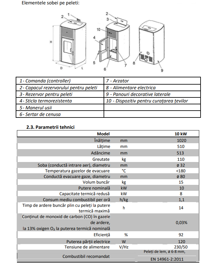 - Timp de ardere buncar plin cu peleti la putere termica maxima: 14 h