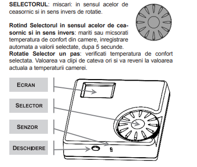 termostat de camera: senzorul de temperatura interna detecteaza temperatura si, comparativ cu valoarea de referinta, porneste sau opreste cererea de incalzire (senzorul de temperatura se afla in partea inferioara a echipamentului);