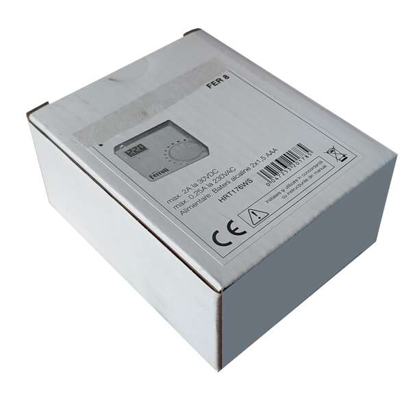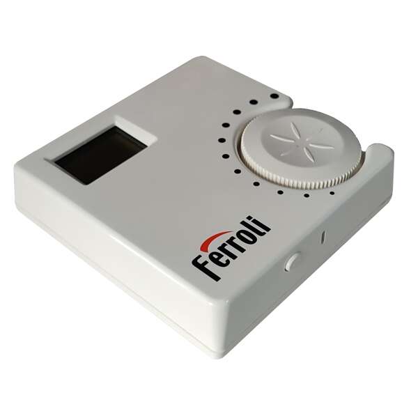 Ferroli FER8 este un termostat de camera conceput pentru a fi utilizat numai cu sistemul de control de incalzire. Acesta este destinat montarii pe perete si poate fi amplasat oriunde s-ar monta si un termostat de camera obisnuit. Termostatul trebuie racordat doar la cazan/centrala si nu necesita alte cabluri deoarece este alimentat cu baterie.