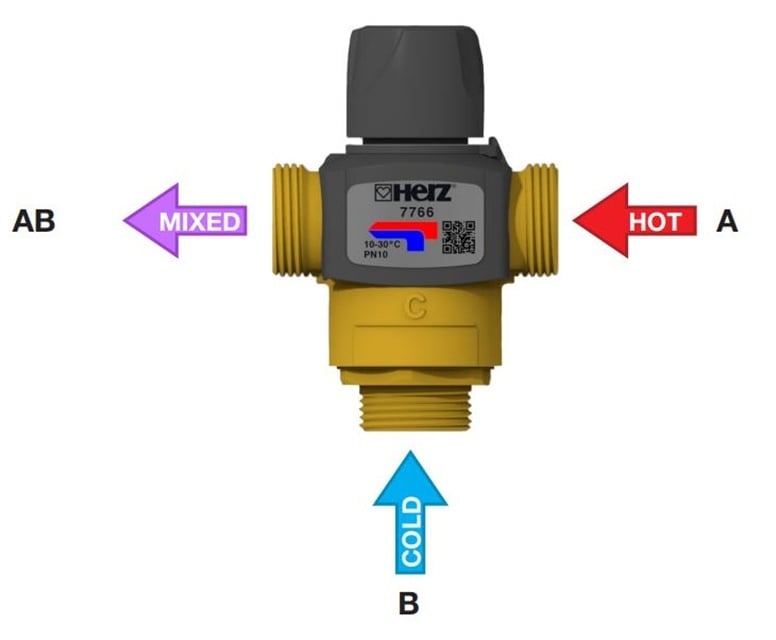 Principiu de funcționareRobinetul de amestec termostatic HERZ pentru încălzire este conectat la alimentarea principală cu apă caldă (A). Robinetul de amestec amestecă agentul termic cald (A) cu agentul termic rece (B) și reglează temperatura care curge în sistem în funcție de valoarea setată (AB).
