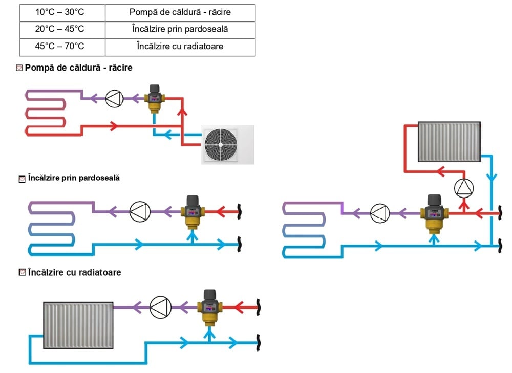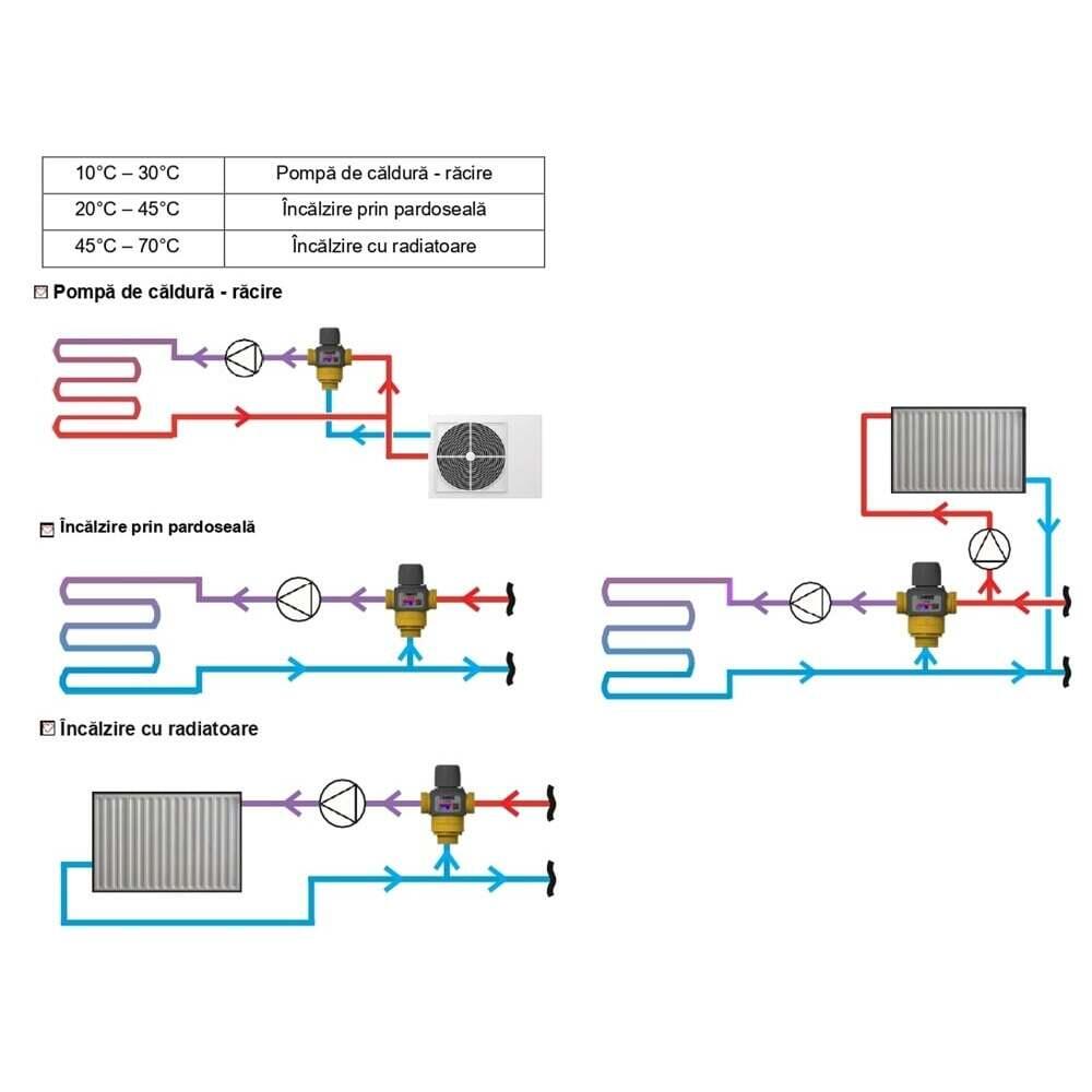 Proiectate pentru precizie și fiabilitate, aceste robinete mențin o temperatură de ieșire constantă, îmbunătățind eficiența sistemului și confortul utilizatorului.Aplicațiile tipice includ sisteme care încorporează pompe de căldură, încălzire prin pardoseală și sisteme de încălzire cu radiatoare, unde controlul precis al temperaturii este esențial pentru siguranță și performanță.